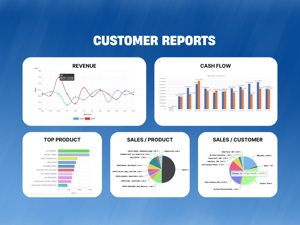 Menyediakan berbagai laporan penting untuk membantu manajemen memahami perkembangan usaha.